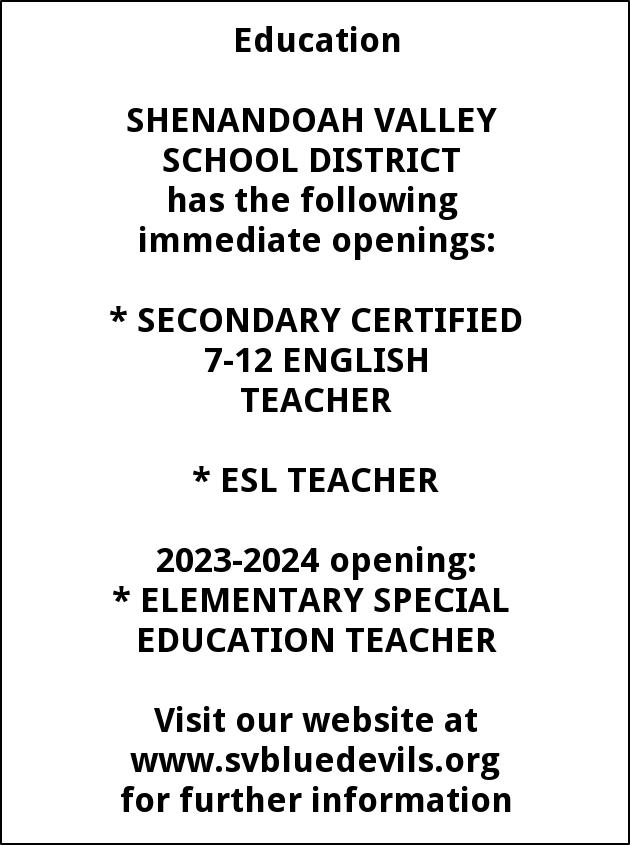 Jan 14, 2023. Shenandoah Valley School District Education Jobs from Republican Herald