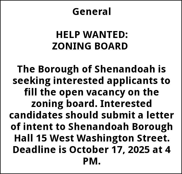 The Borough of Shenandoah is seeking interested applicants to fill the open vacancy on the zoning board. Interested candidates should submit a letter of intent to Shenandoah Borough Hall 15 West Washington Street. Deadline is October 17, 2025 at 4 PM.