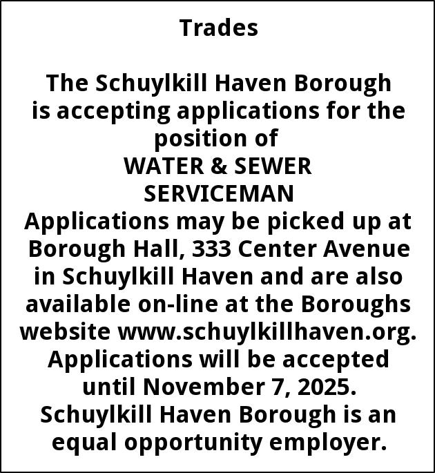 Applications may be picked up at Borough Hall, 333 Center Avenue in Schuylkill Haven and are also available on-line at the Boroughs website www.schuylkillhaven.org. Applications will be accepted until November 7, 2025. Schuylkill Haven Borough is an equal opportunity employer.