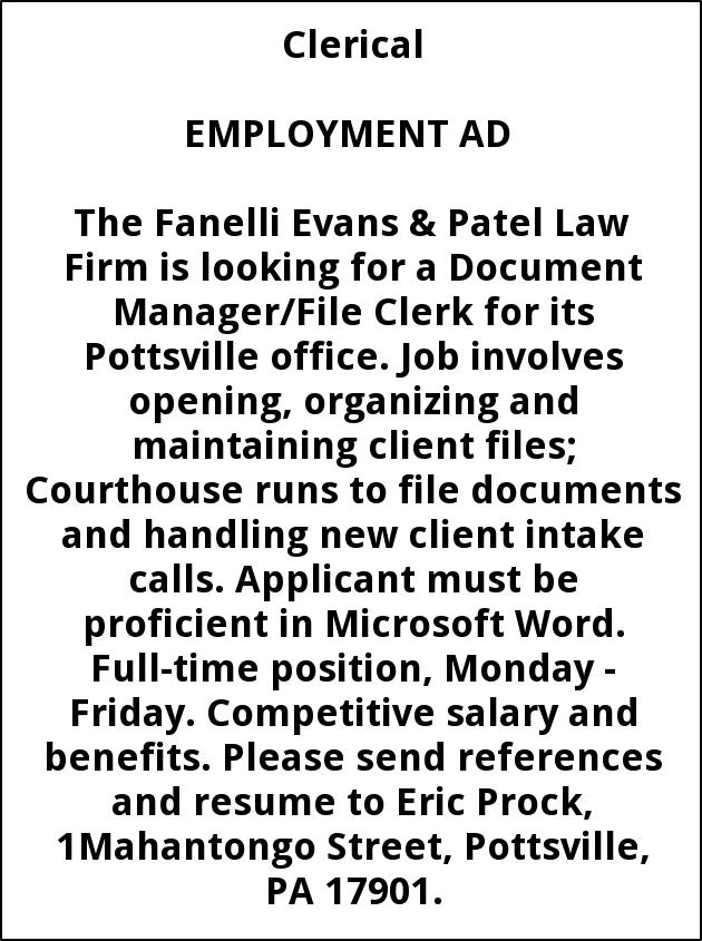 The Fanelli Evans & Patel Law Firm is looking for a Document Manager/File Clerk for its Pottsville office. Job involves opening, organizing and maintaining client files; Courthouse runs to file documents and handling new client intake calls. Applicant must be proficient in Microsoft Word. Full-time position, Monday - Friday. Competitive salary and benefits. Please send references and resume to Eric Prock, 1Mahantongo Street, Pottsville, PA 17901.